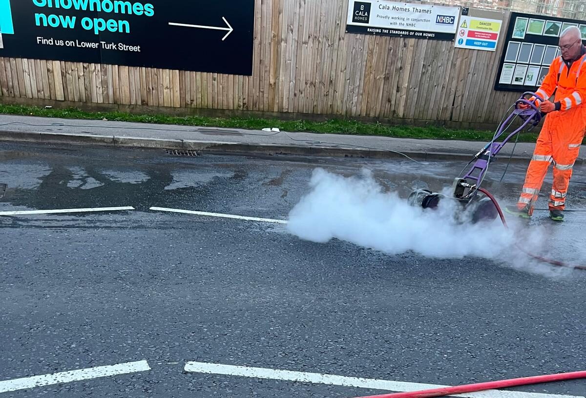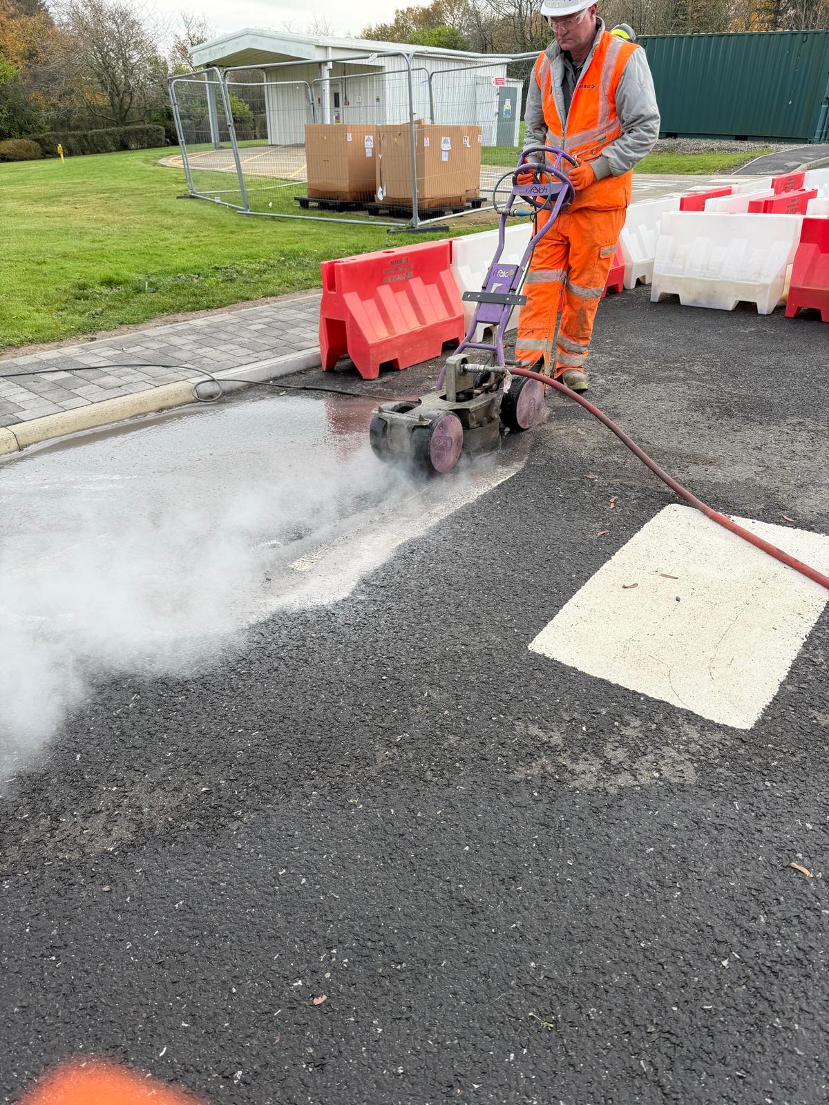 Line Removal is the process of safely eliminating unwanted road markings such as thermoplastic lines and painted markings from surfaces including asphalt, concrete, car parks and playgrounds. These markings are designed to be permanent, so specialist equipment is required to remove them without damaging the underlying surface. UHP water jetting is highly effective on standard asphalt and concrete surfaces, but is not recommended for antiskid or surface dressed finishes where loose chippings are present, as these surfaces are susceptible to aggregate loss. In such cases, mechanical sweeping or alternative methods may be more appropriate.